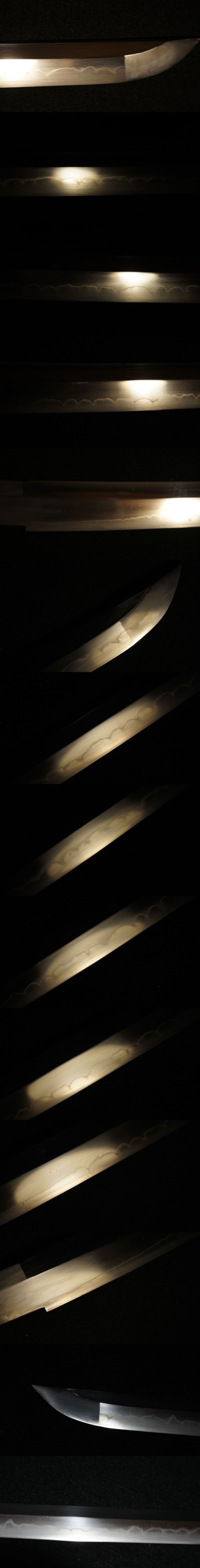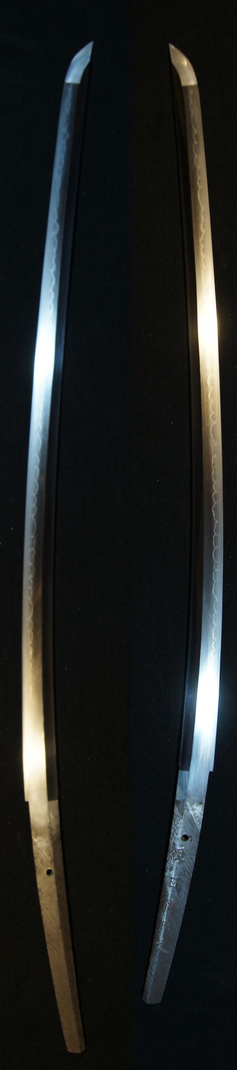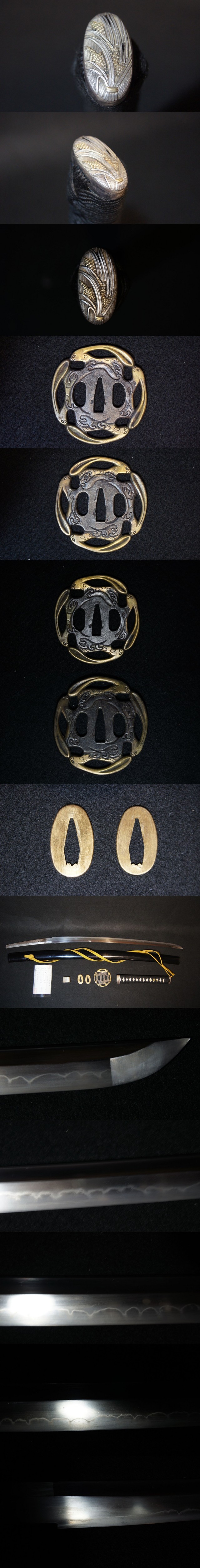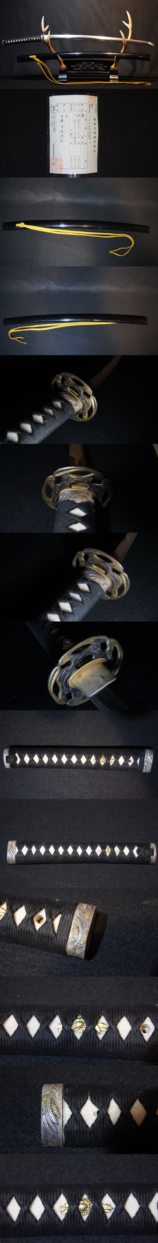 ご覧頂きありがとうございます!銘:在銘【源日信作之】の刀でございます。 鎬造り、庵棟、地肌/板目に杢交じり。刃紋/互の目丁子乱れ刃。鋩子/乱れこみ、先小丸。昭和の刀で、「源日信」と銘あるも、作品・資料少なく委細不明。直ぐ調に焼き出し、匂口の締まった互の目丁子乱れが迫力ある刀。外装は近世作での綺麗なものでうまく纏められている。外装/鐔/波に兎図。目貫/笹蟹図。縁頭/稲穂図。