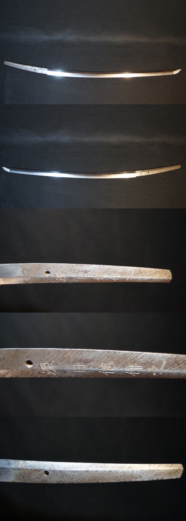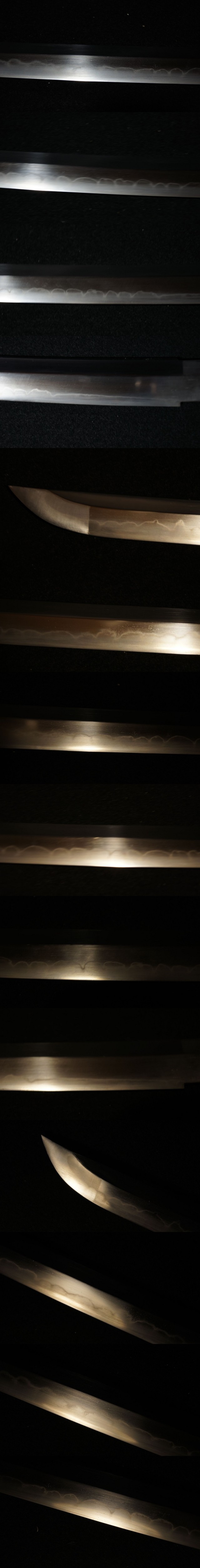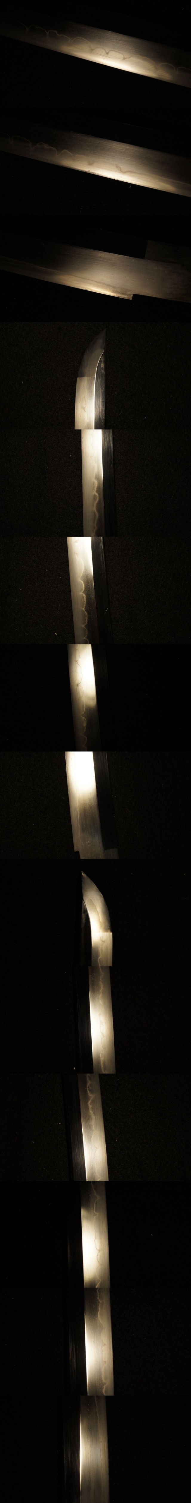 ご覧頂きありがとうございます!銘:在銘【源日信作之】の刀でございます。 鎬造り、庵棟、地肌/板目に杢交じり。刃紋/互の目丁子乱れ刃。鋩子/乱れこみ、先小丸。昭和の刀で、「源日信」と銘あるも、作品・資料少なく委細不明。直ぐ調に焼き出し、匂口の締まった互の目丁子乱れが迫力ある刀。外装は近世作での綺麗なものでうまく纏められている。外装/鐔/波に兎図。目貫/笹蟹図。縁頭/稲穂図。